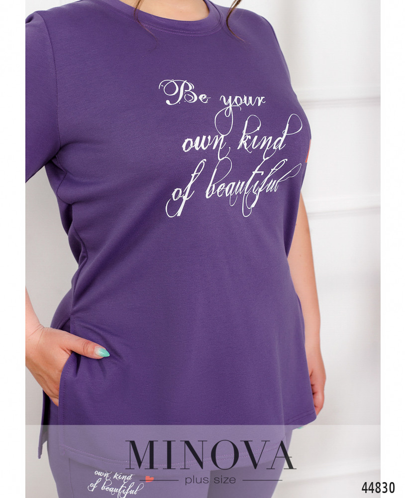 Привлекательный костюм-двойка плюс сайз. Футболка мягкая, с ярким стильным принтом на груди, вырез горловины полукруглый, рукава без манжет, по бокам - небольшие разрезы на подоле. Карманов и застёжек нет. Брюки с высокой талией, с мягкими манжетами, в пояс вшита резинка, по бокам - карманы в шве.