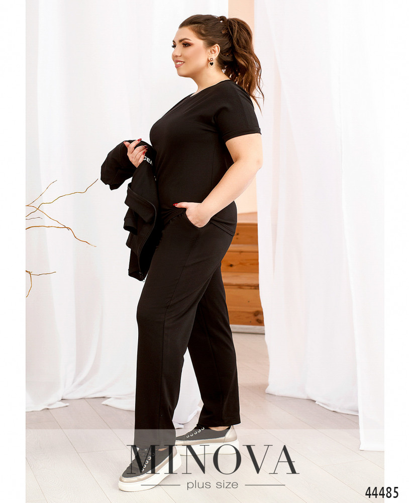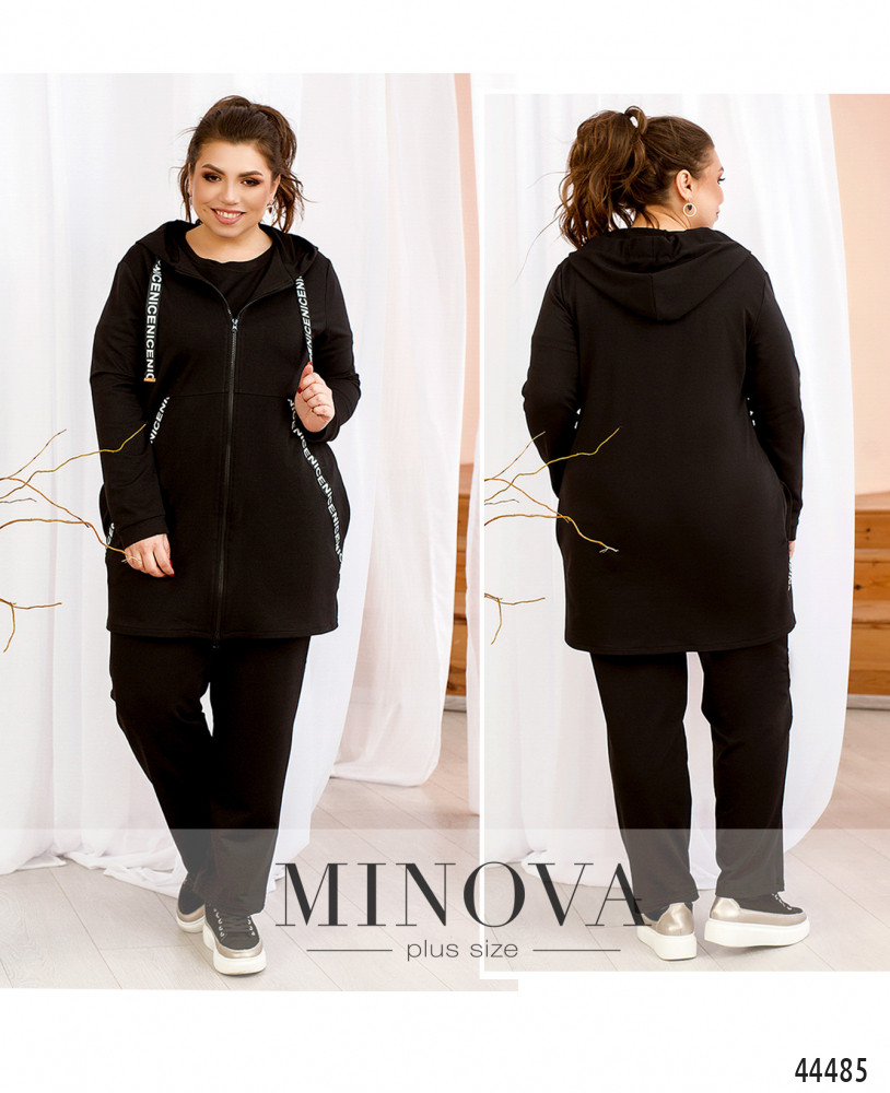 Оригинальный костюм-тройка плюс сайз. Толстовка длинная, украшена яркими лентами, такие же ленты, но с металлическими наконечниками, пропущены через капюшон. Подкладки нет, по бокам - карманы в шве. Рукава с небольшими мягкими манжетами. Футболка с коротким рукавом с мягким манжетом, вырез горловины полукруглый, застёжек и карманов нет. Брюки с высокой талией, в пояс вшита резинка, застёжек нет, по бокам карманы в шве.