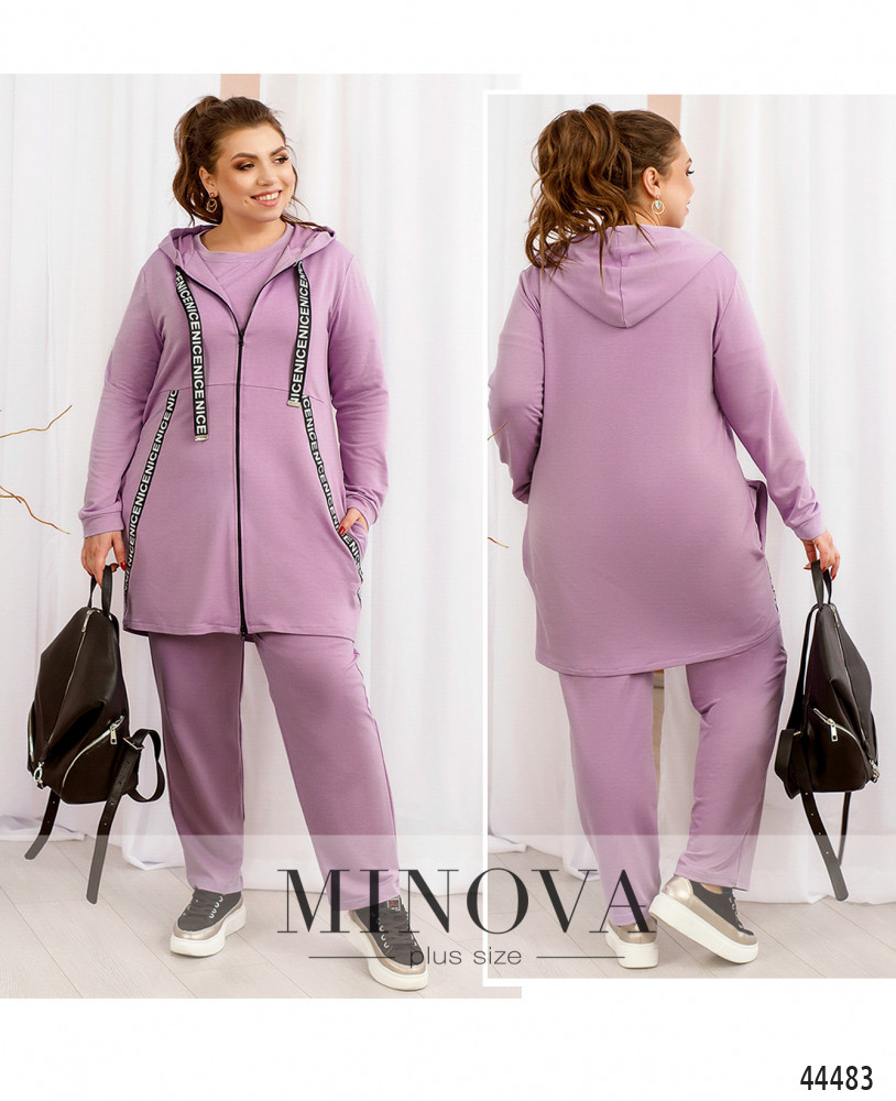 Оригинальный костюм-тройка плюс сайз. Толстовка длинная, украшена яркими лентами, такие же ленты, но с металлическими наконечниками, пропущены через капюшон. Подкладки нет, по бокам - карманы в шве. Рукава с небольшими мягкими манжетами. Футболка с коротким рукавом с мягким манжетом, вырез горловины полукруглый, застёжек и карманов нет. Брюки с высокой талией, в пояс вшита резинка, застёжек нет, по бокам карманы в шве.