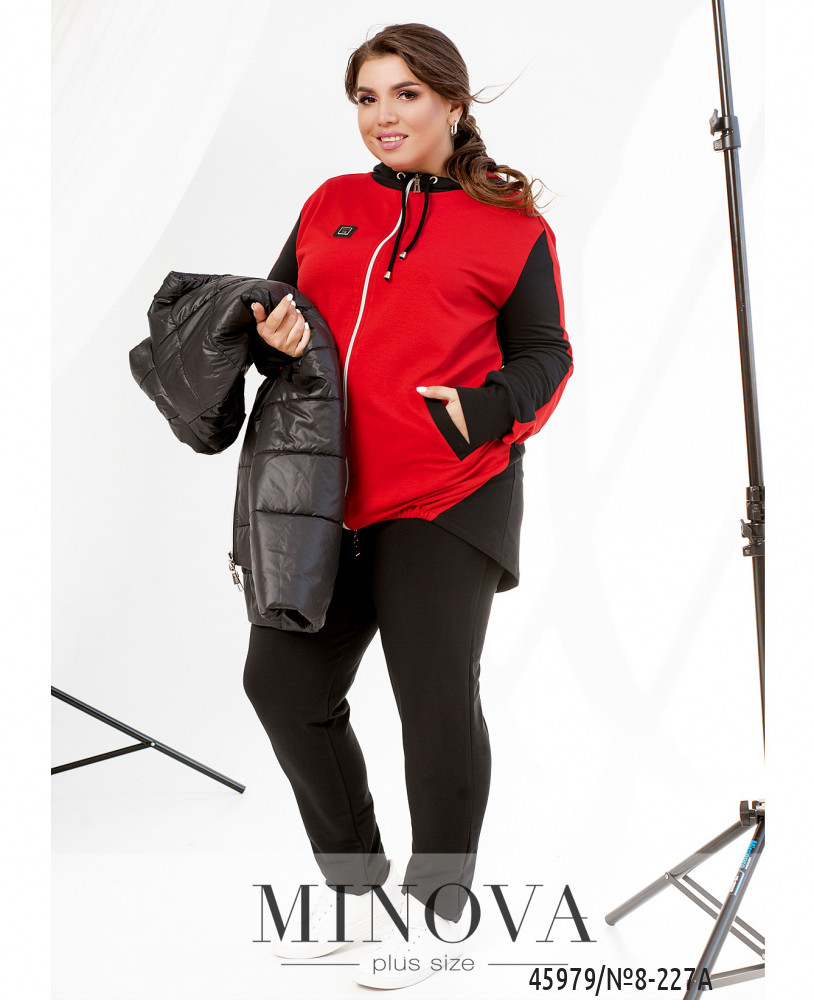 Костюм-тройка большого размера. Жилетка простёгана, по бокам - врезные карманы под молнией, застёгивается на молнию, молния с двумя бегунками, изнутри подкладка. Свитшот с капюшоном и карманами, на груди декоративная нашивка, на рукавах лампасы. Застёгивается на молнию с двумя бегунками. Брюки однотонные, в пояс вшита резинка, посадка высокая, по бокам врезные карманы.