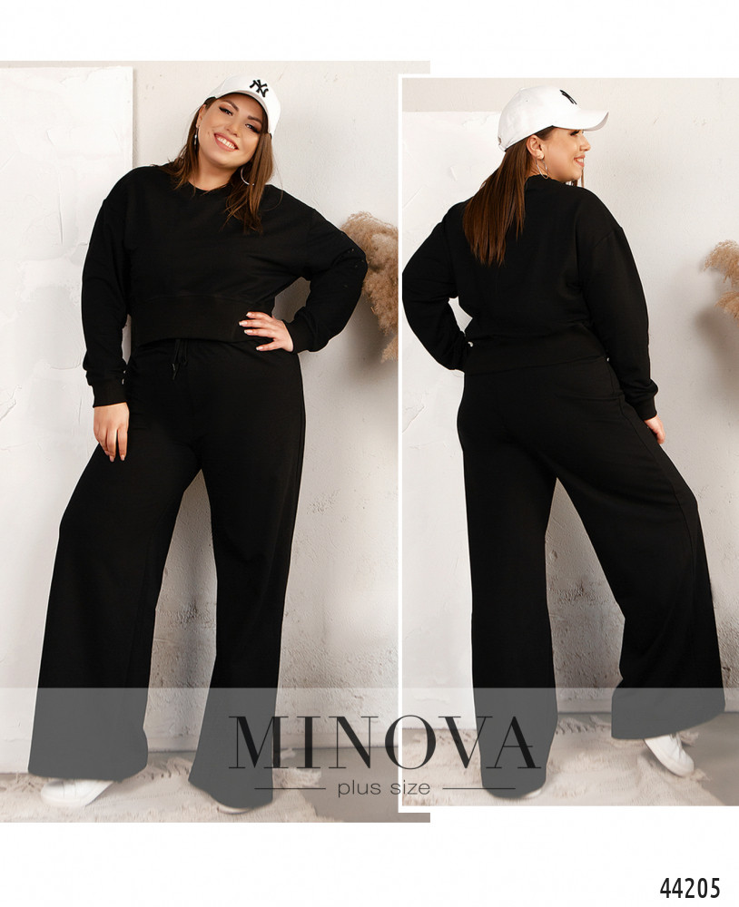 Комфортный мягкий костюм плюс сайз, свитшот с манжетами на рукавах, горловине и подоле. Линия плеча немного приспущена. Застёжек и карманов нет. Рукава свободные, к манжету сужаются. Брюки широкие, свободные, без карманов, в пояс вшита резинка и пропущен шнурок. Посадка высокая.