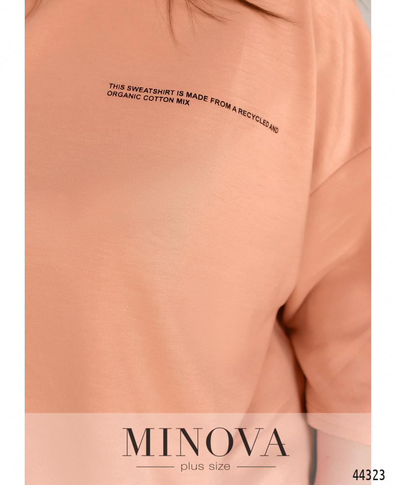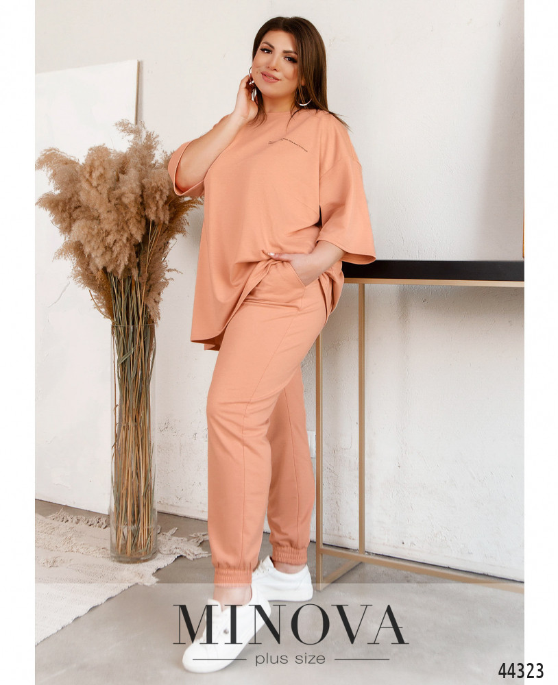 Стильный костюм-двойка большого размера, футболка с рукавами без манжет, вырез горловины полукруглый, без застёжек и карманов. Брюки со вшитой в манжеты и в пояс резинкой, по бокам - карманы в шве, талия высокая.