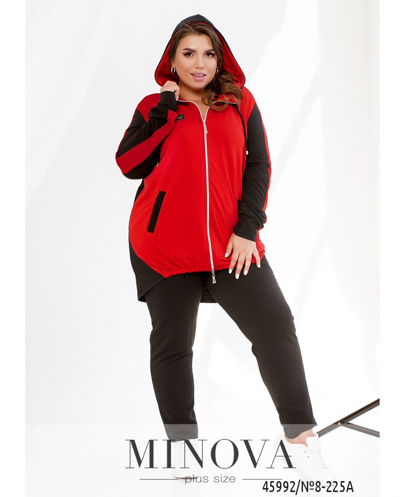 Удобный и яркий повседневный костюм-двойка батал в спортивном стиле. Кофта с молнией по центру, застёгивается на два бегунка, по бокам - карманы, рукава с мягкими манжетами, в наличии капюшон, через него пропущен шнурок. Брюки с высокой посадкой, по бокам - карманы, в пояс вшита резинка, без манжет.