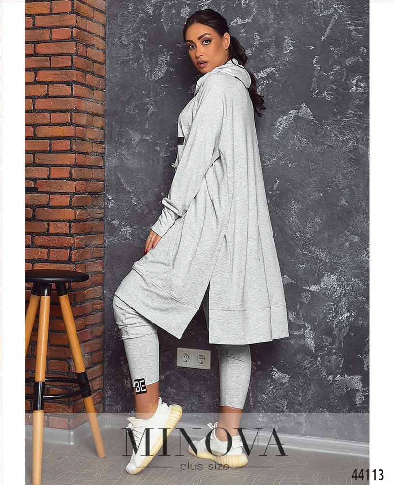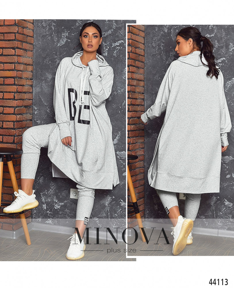 Оригинальный костюм с длинной толстовкой и брюками. Толстовка с капюшоном, через него пропущен шнурок. Рукава с мягкими манжетами, спереди на талии - карман-кенгуру. По бокам - очень длинные разрезы. На груди крупный принт. Брюки с длинными манжетами, на левом манжете декоративная нашивка, в пояс вшита резинка, по бокам - карманы в шве, посадка высокая.
