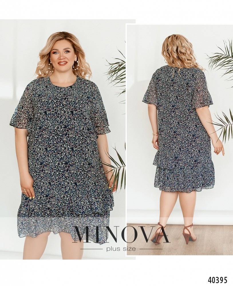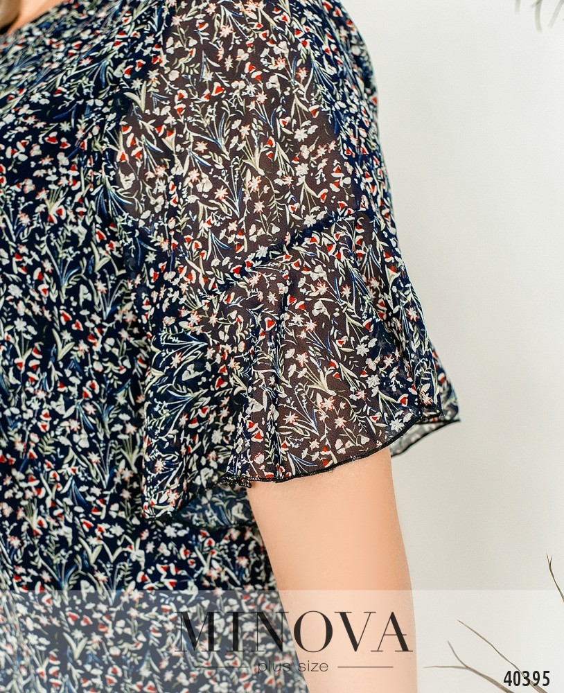 Лёгкое и удобное платье батал с мягкой нижней тканью и полупрозрачной верхней. Подол и рукава украшены оборками, которые на подоле начинаются сбоку. Вырез горловины полукруглый. Карманов нет. Застёжка - пуговка сзади под шеей.