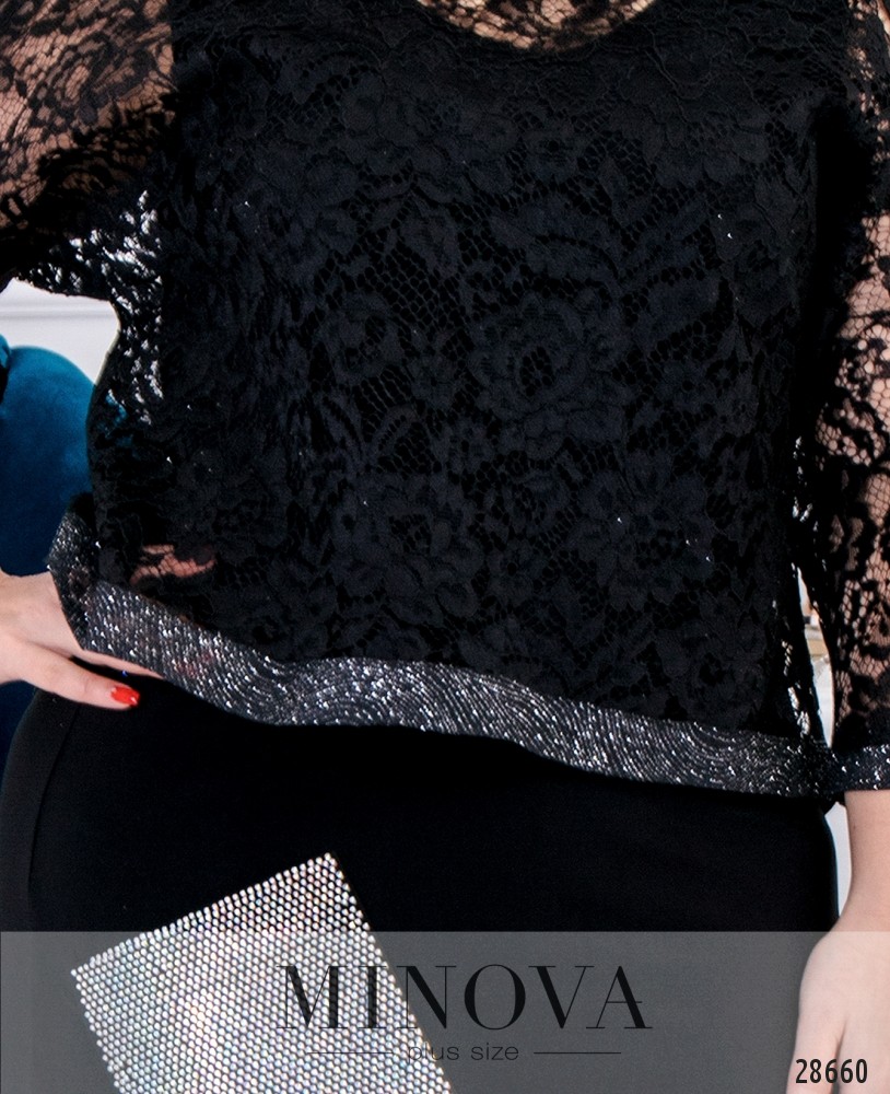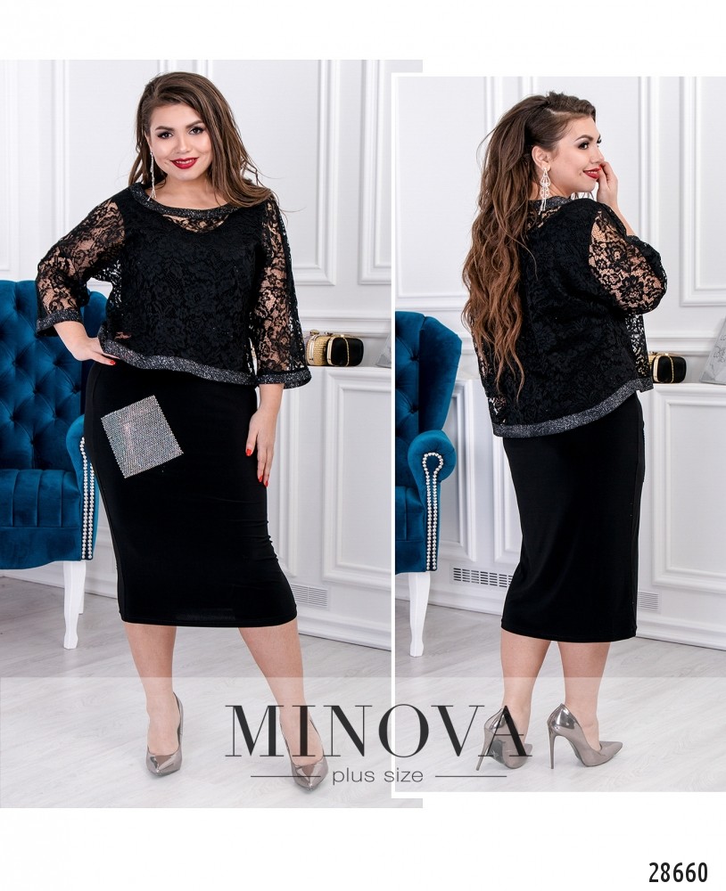 Оригинальное приталенное платье-миди с кружевным болеро. Трикотажное платье без рукавов с накладным блестящим карманом. К платью прилагается кружевное болеро с рукавами ¾ и блестящим кантом на подоле и рукавах. Спинка удлинена и закруглена.