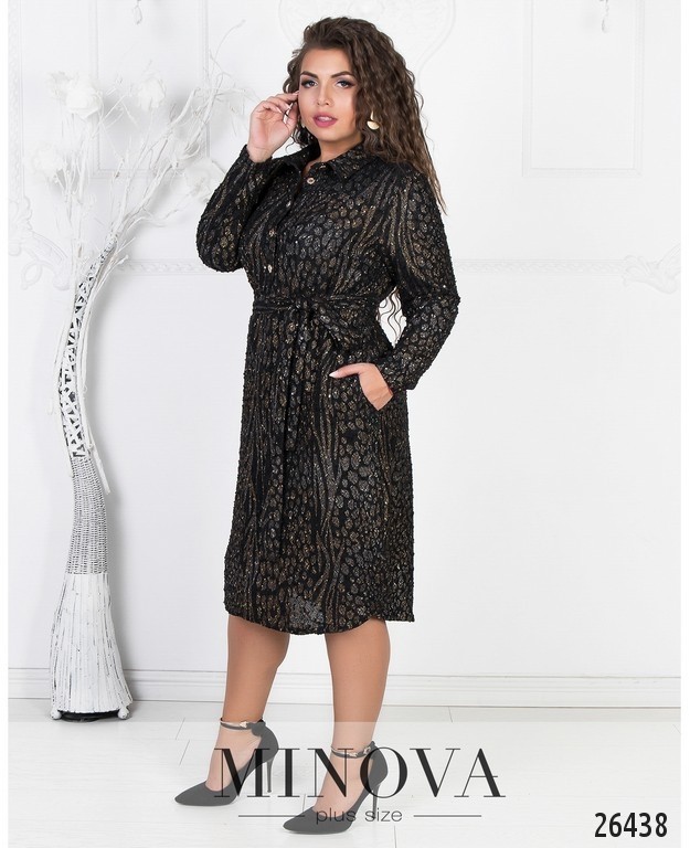 Яркое платье-рубашка прямого кроя изготовлено из трикотажа букле и декорировано яркими пайетками. Талию можно акцентировать пояском, который идет в комплекте. Рукава полной длины. Подол закруглён и по бокам небольшие разрезы, которые придадут свободы движениям.