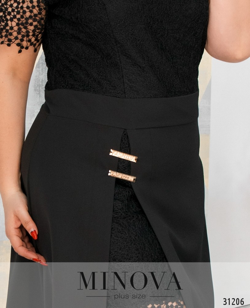 Элегантное платье с двойной юбкой. Отрезной лиф с короткими рукавами отделан кружевом. Рукава выполнены в технике кроше. Отрезной от талии подол выполнен из двух слоев: подъюбника и верхнего слоя с разрезом. Нижний слой платья выполнен на подкладке и оформлен сверху кружевом и кроше. Верхний слой изготовлен из однотонного материала и закреплен двумя металлическими деталями. На спине платье застегивается на скрытую молнию.