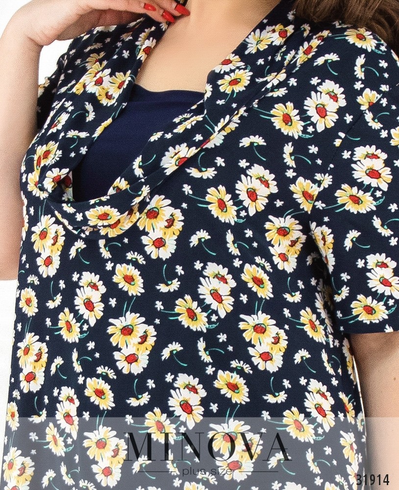 Яркое платье в цветок с воротником хомутом. Платье свободного кроя, с короткими рукавами и вшитыми карманами. Лиф дополнен однотонной подкладкой. Подол на лицевой стороне слегка задрапирован.