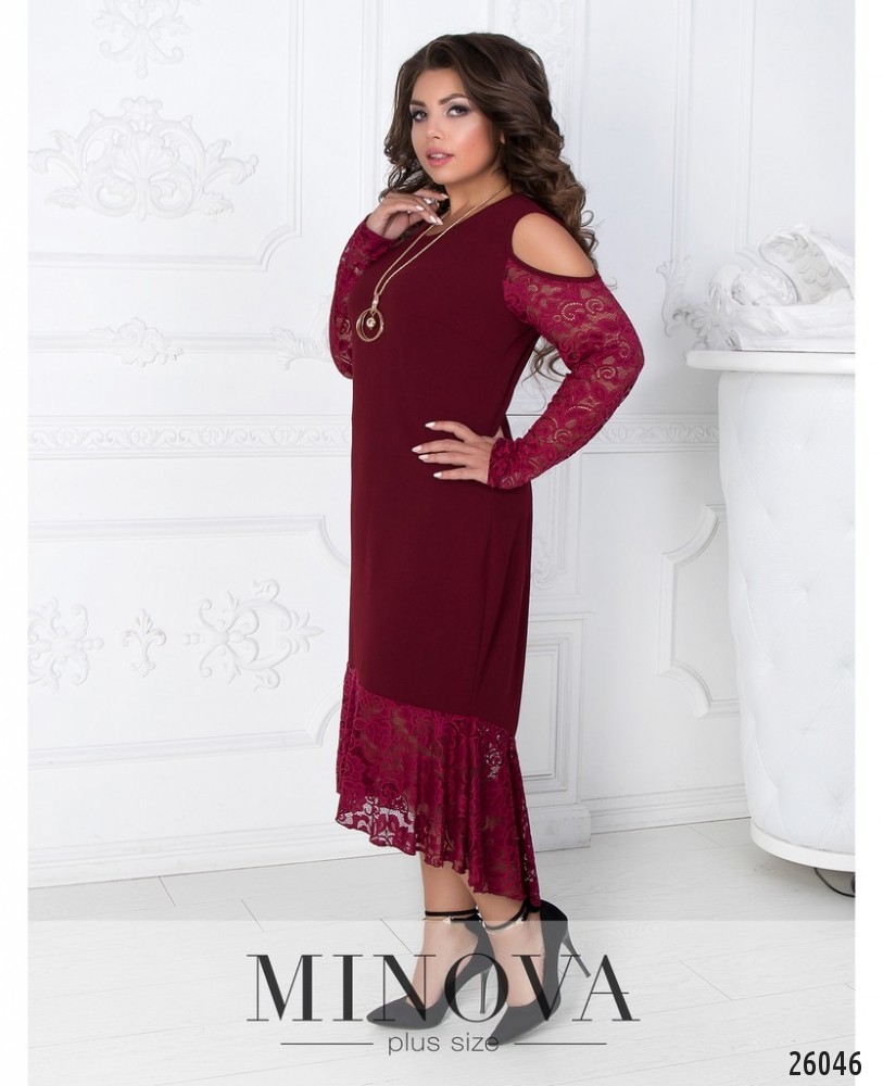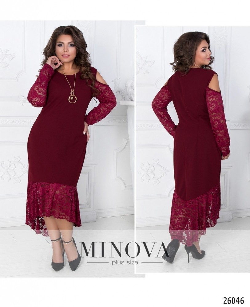 Изящное вечернее платье с подолом а-ля «русалка» и вырезами на плечах. Платье красиво подчеркивает изгибы фигуры. Рукава и подол выполнены из кружева. Украшение входит в комплект.