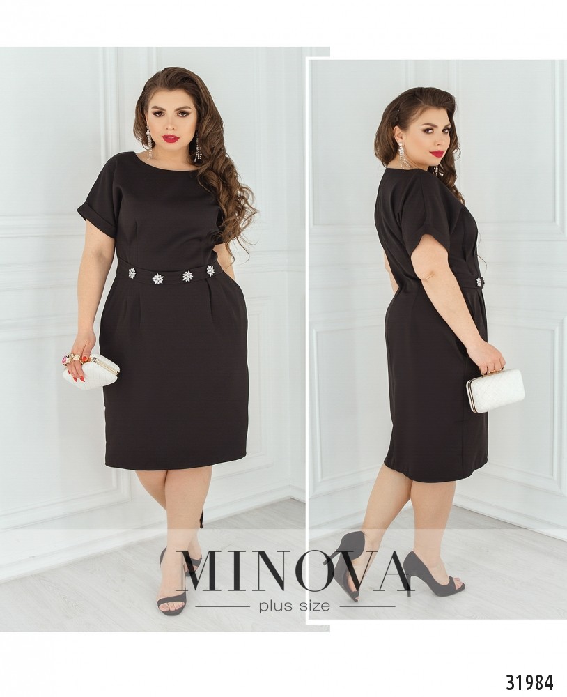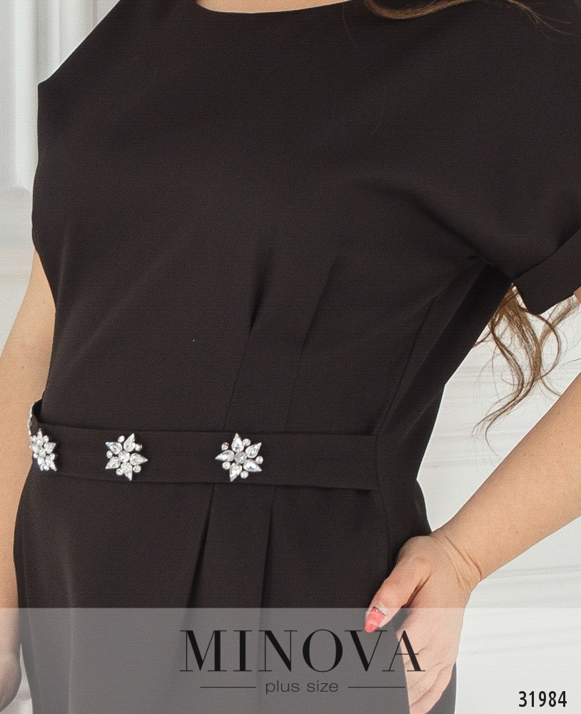 Платье по фигуре с акцентом на талии. Платье с короткими рукавами, собранными во внешние манжеты. От линии пояса подол оформлен защипами и дополнен карманами. Талия подчеркнута поясом-вставкой с блестящими брошами. Спинка выполнена со вшитой молнией.