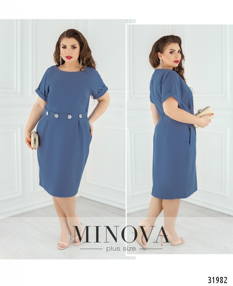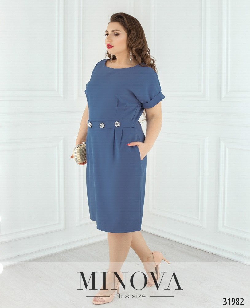 Платье по фигуре с акцентом на талии. Платье с короткими рукавами, собранными во внешние манжеты. От линии пояса подол оформлен защипами и дополнен карманами. Талия подчеркнута поясом-вставкой с блестящими брошами. Спинка выполнена со вшитой молнией.