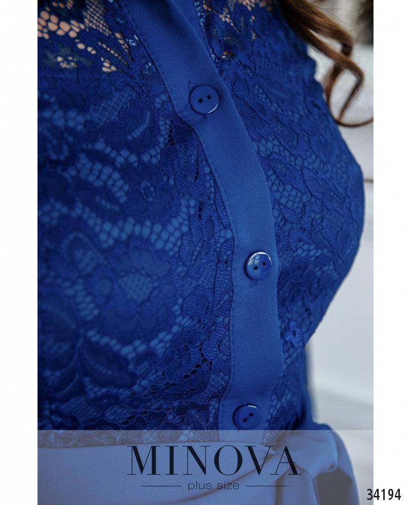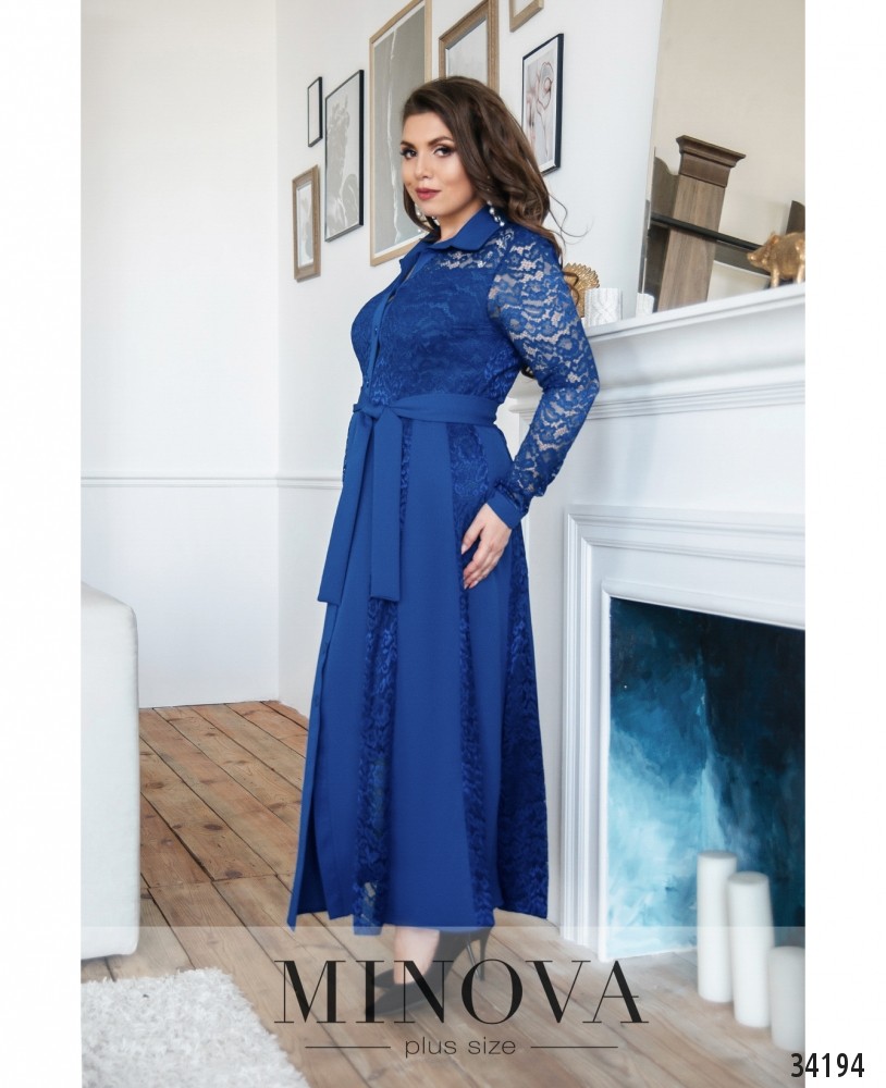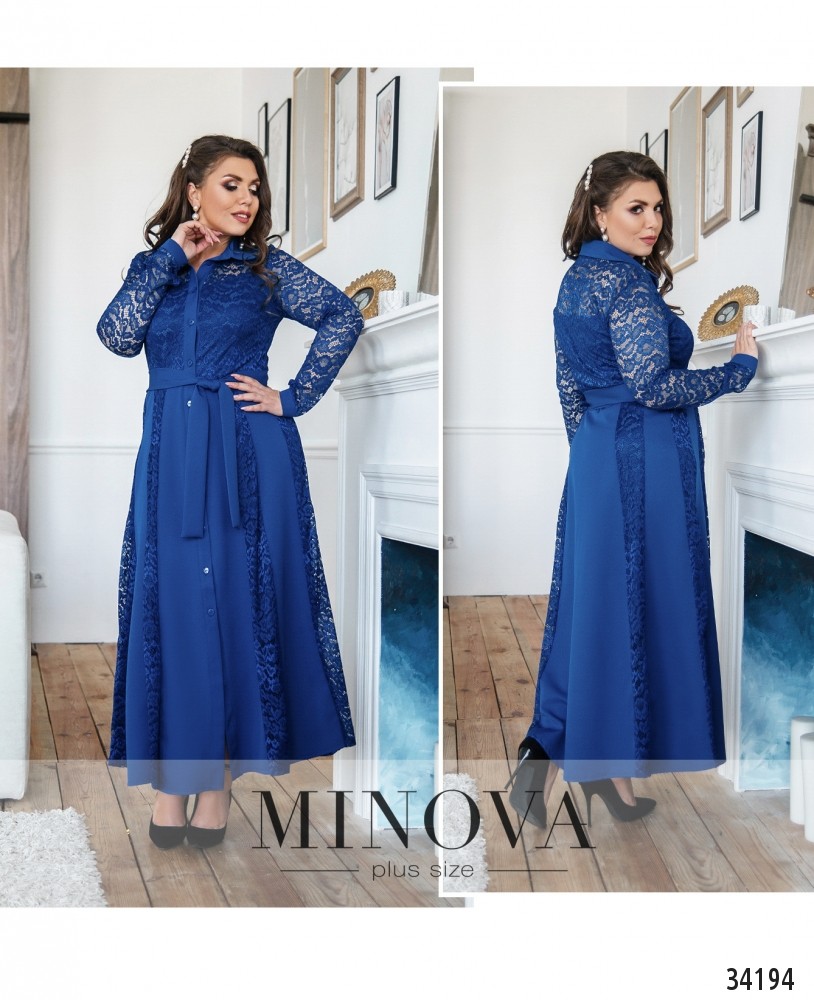 Платья А-силуэта отлично сидят на любой фигуре, приближая её к «песочным часам» за счёт расклешённого подола. Minova представляет новые модели нарядных платьев с элегантными гипюровыми вставками. Платье батал с отложным воротничком и полным рядом пуговиц спереди – от воротничка до низу подола. Внутренний слой гладкий, приятный, сверху на лифе – гипюр (с обеих сторон). Рукава и верхняя часть лифа из прозрачного гипюра без подкладки. На рукавах манжеты с одной пуговкой. Подол с клиновидными вставками, причём почти до низу присутствует подкладка, так что кружево не просвечивает, а приблизительно 10 см снизу – без подкладки, так что платье не выглядит слишком «тяжёлым». В наличии широкий мягкий пояс. Предпочтительно выбирать обувь на высоком каблуке.