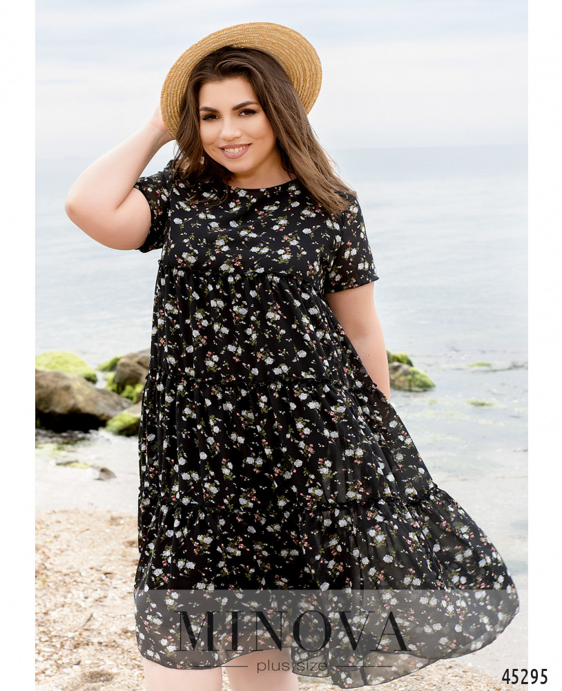 Стильное и романтичное платье батал с рукавами-фонариками, в которые вшиты резинки. Верхний слой - полупрозрачный, с несколькими рядами оборок, нижний - мягкая подкладка (рукава без подкладки). Застёжек и карманов нет.