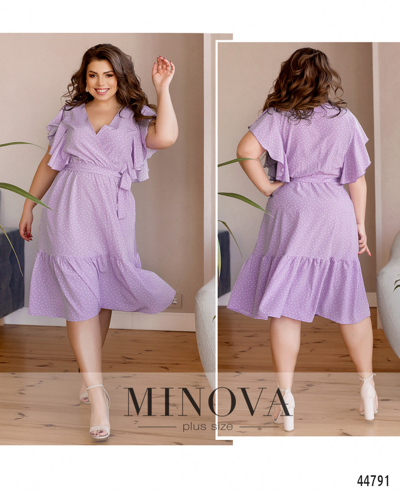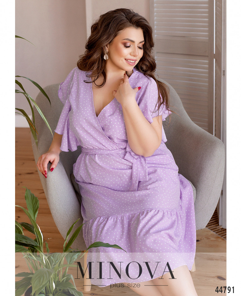 Стильное и элегантное платье батал, лиф подшит на запАх к подолу, в пояс вшита резинка, подол украшен оборками. Рукава - ниспадающие мягкие оборки-крылышки. По бокам - карманы в шве. В комплекте пояс в тон. Застёжек нет. Пояс/аксессуар входит в комплект.