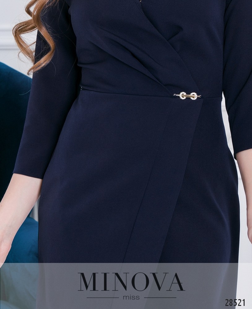 Классическое платье с вырезом и подолом на запАх. Отрезной лиф с рукавами ¾ украшен защипами, создающими эффект драпировки. Отрезная линия талии украшена пришитой декоративной деталью. На спине платье застегивается на скрытую молнию.