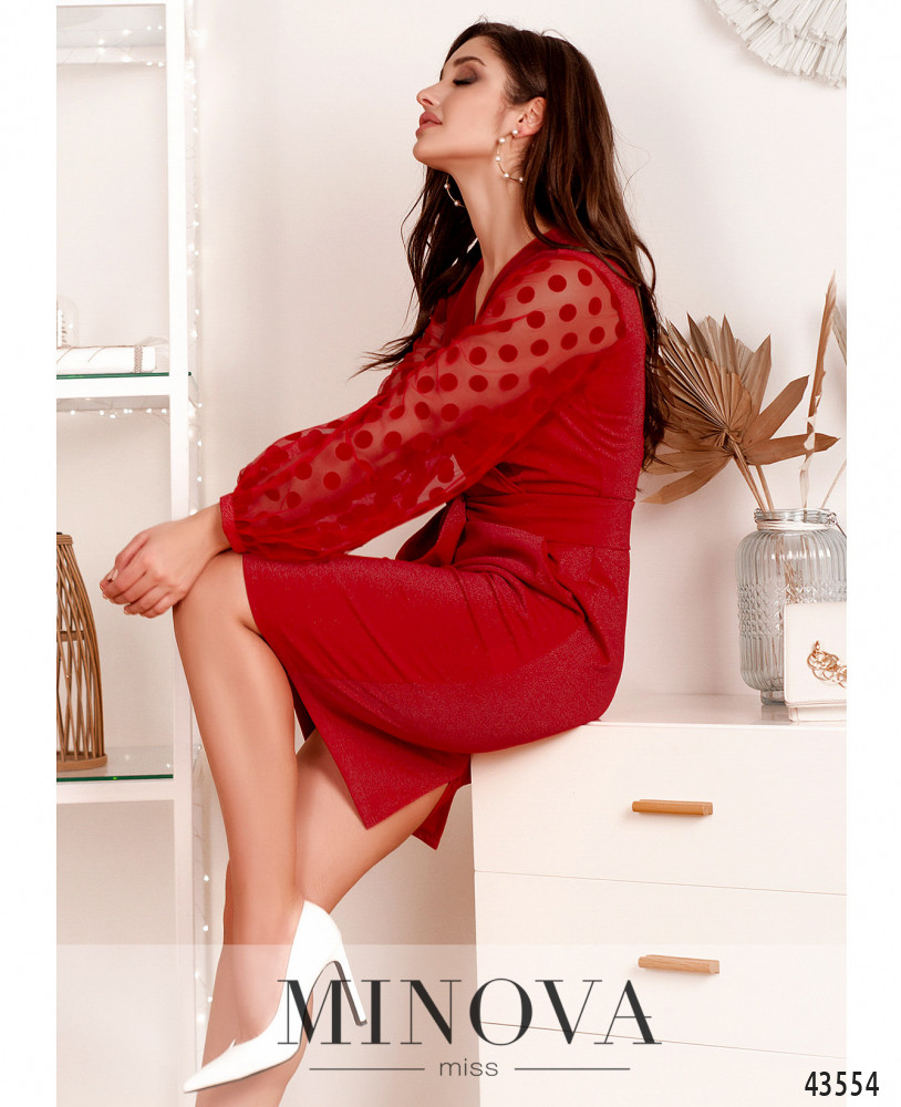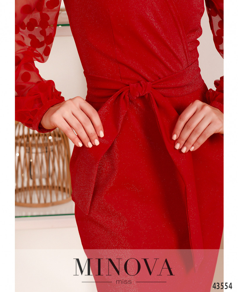 Стильное платье с поясом и полупрозрачными рукавами с небольшими прорезиненными манжетами. Подшито на запАх, по бокам - врезные карманы, застёжка - молния, вшитая по спинке. Силуэт приталенный, сзади на подоле шлица. Ткань с люрексом.
