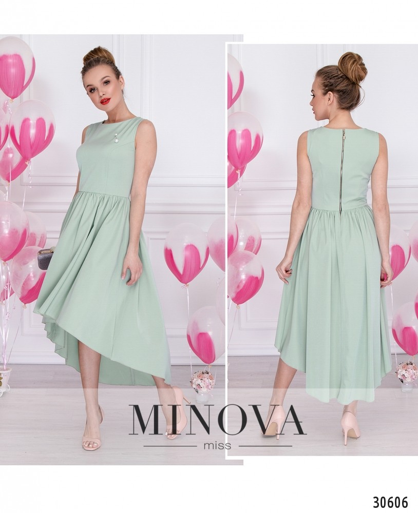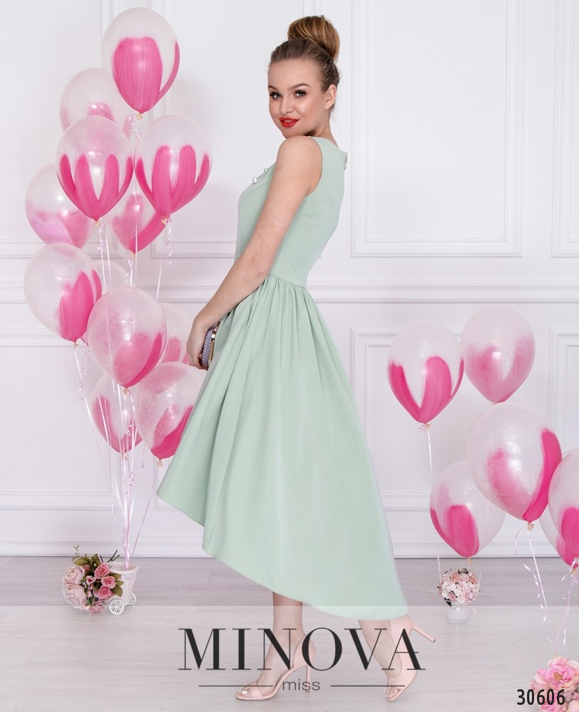 Воздушное платье с разно уровневым подолом. Отрезной лиф без рукавов украшен брошью с бусинами. Расклешенный подол собран в складки и укорочен на лицевой стороне. На спине платье застегивается на фактурную молнию.