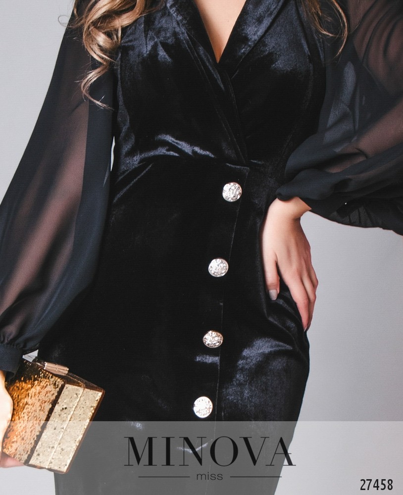 Бархатное платье-жакет с рукавами – буфами. Элегантное платье с отложным воротником и крупными декоративными пуговицами. Ряд пуговиц продолжен аккуратным кокетливым разрезом. Платье с отрезной талией и лифом на запах оформлено объемными полупрозрачными рукавами из шифона. Рукава собраны в манжеты с пуговицами (пуговицы действующие). В изделии отсутствует молния.