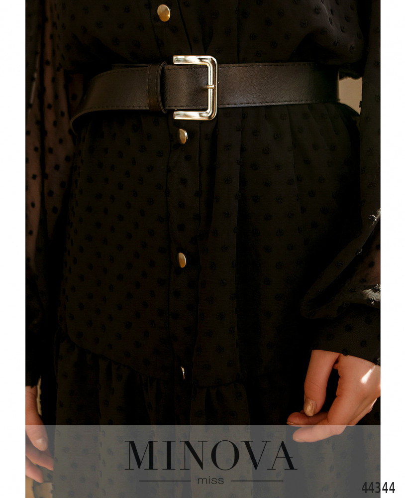 Романтичное платье с отложным воротничком и рядом пуговиц спереди на планке. Рукава с манжетами, на манжетах по одной пуговице. Рукав со спущенной линией плеча, к манжету зауженный. Под полупрозрачным верхним слоем - мягкая подкладка. Карманов нет, на подоле оборки.