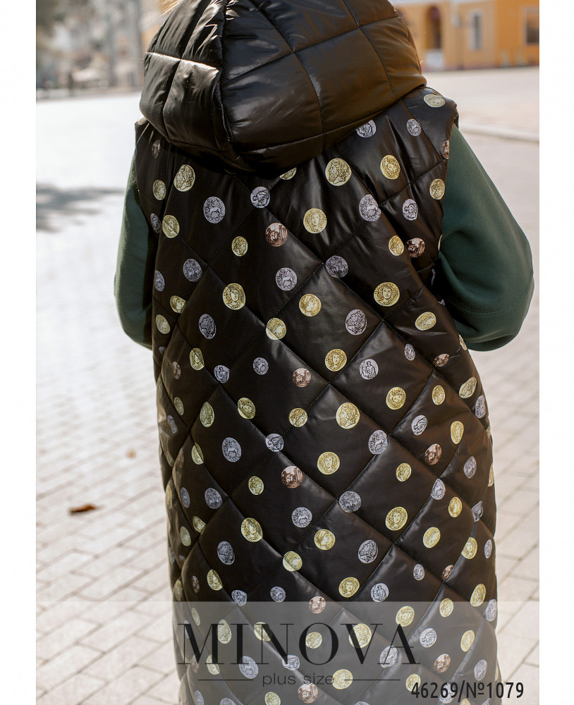 Длинный мягкий жилет с ассиметричным низом, удлиненным по спинке, поможет создать базовый образ, который выглядит выразительно, уютно и комфортно. Изюминкой данной модели является сочетание лаконичной черной передней части, дополненной накладными карманами, и яркой спинкой с принтом.
